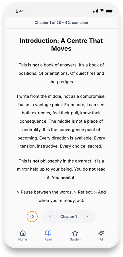 A reflective companion app blending reading, audio, and AI, guiding users through meditative essays, symbolic visuals, and interactive self-inquiry.
